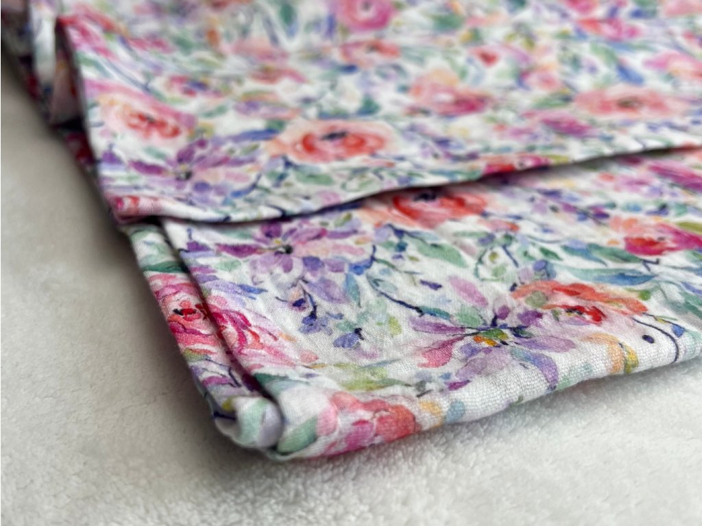 Bavlněný zavinovací šátek - mušelínový, v originál květinové barvě je lehký, prodyšný, vhodný zejména pro podporu bříška v letním období. Délka/šířka: 400 x 40 cm. Jemná opora pro ženy v těhotenství i po porodu, doporučený pro konfekční velikost 40-44/46.
