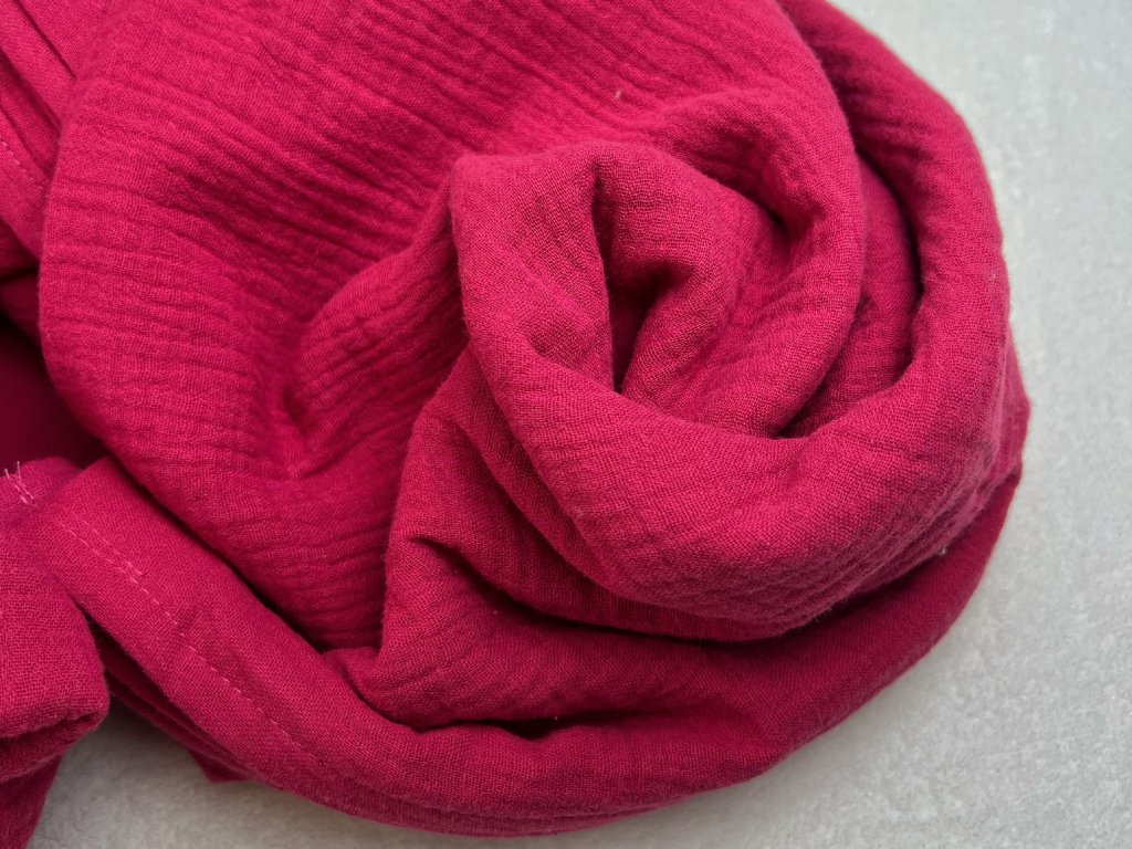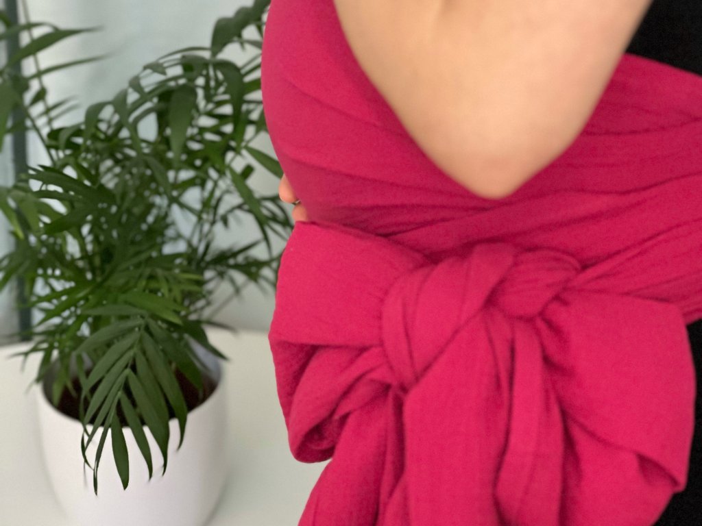 Bavlněný zavinovací šátek - mušelínový, v originál malinové barvě je lehký, prodyšný, vhodný zejména pro podporu bříška v letním období. Délka/šířka: 430 x 40 cm. Jemná opora pro ženy v těhotenství i po porodu, doporučený pro konfekční velikost 42–44/46.