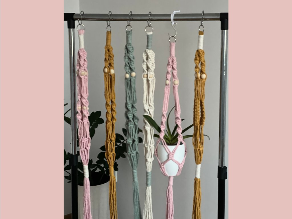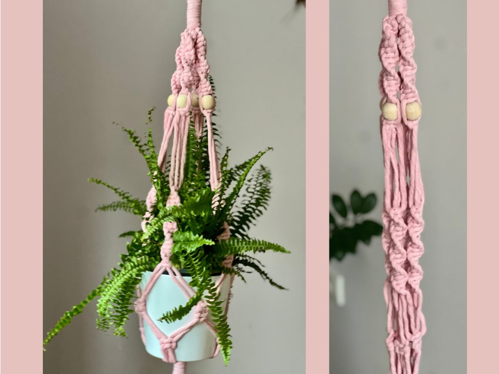 Celorůžové macramé krásně zjemní interiér, nechá rostlinu vyniknout a vytvoří pocit útulna i lehkosti zároveň. Uzel po uzlu drží květináč stabilně, zatímco dlouhé splývavé prameny dodávají závěsu vzdušnost a elegantní linii. Dřevěné korálky v horní části přidávají přírodní akcent a drobný šperk v celé kompozici.